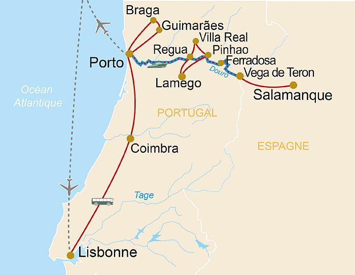 Si Lisbonne et Belém rappellent l'aventure des grandes découvertes et l'ouverture du Portugal sur le monde lointain, le Douro fut longtemps le garant de la prospérité du pays. Seul fleuve majeur du Portugal, il fut, jusqu’à l’avènement du transport routier, la voie essentielle de communication qui assurait le transport du célèbre vin de Porto des collines du Haut Douro vers Porto, le port exportateur. Dans des paysages somptueux, le fleuve déroule tranquillement ses méandres entre ses rives couvertes de vignobles. La prospérité de ces campagnes a permis le développement de petites cités agrémentées d’églises romanes et baroques, aux places bordées de riches maisons aux façades exubérantes. La croisière que nous effectuerons offre également une excursion à Salamanque, prestigieuse ville universitaire espagnole ainsi qu'une découverte de Lisbonne et Coimbra. lire moins