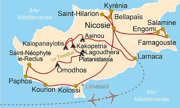 Nous partirons le matin en direction de la région du Troodos (Unesco), massif montagneux central de l’île et véritable conservatoire d’art byzantin où, dans les vallées difficiles d’accès, s'installèrent les chrétiens menacés par la multiplication des incursions arabes du VIIe au IXe siècle. Au cours des siècles suivants, le Troodos vit se multiplier petits monastères et modestes églises, édifiées sur le plan classique à croix grecque, mais d’une richesse artistique inouïe.
