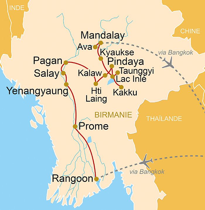 L’histoire du pays est longue et complexe avec l’entrée en scène des Birmans qui s'imposèrent aux prédécesseurs môns et pyus, avant que les Shans ne rebattent les cartes en s’installant sur leur plateau. En cette terre de rencontres, la Birmanie doit son unité au bouddhisme theravada dont les plus belles réalisations sont les monuments de Pagan et plus tard, en Haute-Birmanie, ceux d’Ava, Amarapura et Mandalay. Nombreuses sont aussi les œuvres discrètes qui seront notre « jardin secret », où des pèlerins anonymes ont laissé leur trace, reflet de leur personnalité. Nous serons de même sous le charme de l’univers lacustre du lac Inlay où paysage, agriculture, habitat et architecture se conjuguent différemment. Ce circuit réservera une place aux minorités, particulièrement aux Pa’o du Plateau shan. Installés en ces lieux vallonnés depuis environ 1 000 ans, ces Tibéto-birmans appuient leurs croyances sur un subtil enchevêtrement de bouddhisme et d’animisme. Un de leurs lieux emblématiques est Kakku où plus de 2 500 stupas serrés sur 14 000 m² étirent vers le ciel leur pointe fuselée, couronnée d’une petite ombrelle aux clochettes tintinnabulant. Nous y serons pour leur festival des moissons, avant l’aube, moment où les pèlerins apportent solennellement leurs offrandes colorées alors que le soir des milliers de bougies font vibrer les lieux. lire moins