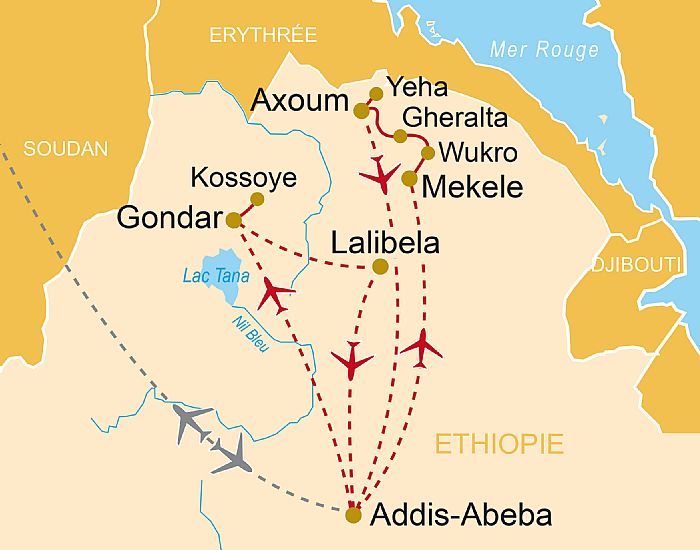 Le berceau historique et culturel de l'Ethiopie se trouve sur les hauts plateaux d'Abyssinie aux paysages de pâturages dominés par des montagnes forteresses. Axoum, ville au passé deux fois millénaire, fut le centre d'une civilisation brillante qu'illustrent ses vestiges. Aux XIIe et XIIIe siècles, à Lalibela, capitale de l'Abyssinie, sortirent de terre de stupéfiantes églises monolithiques qui comptent parmi les merveilles du monde. Plus tard, au XVIIe siècle, l'empereur Fasilidas fit édifier à Gondar un florilège de châteaux et d'églises magnifiquement conservés. Avant qu'au XIXe siècle, le roi Yohannes IV, le Roi des Rois, qui réussit à contenir les offensives coloniales ottomanes et italiennes, ne dote Mekele – devenue à son tour capitale – d'un étonnant château.